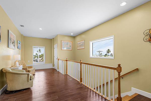 Features queen size bed, overhead ceiling fans, tile floor, double closet with separate set of draws – direct access to the wrap-around balcony with pool deck below and extensive water views across Matlacha pass.
