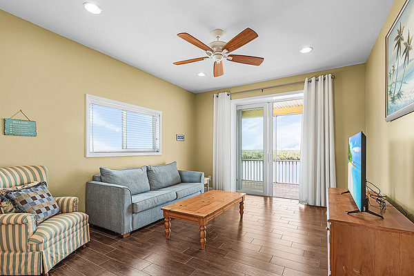 Features queen size bed, overhead ceiling fans, tile floor, double closet with separate set of draws – direct access to the wrap-around balcony with pool deck below and extensive water views across Matlacha pass.